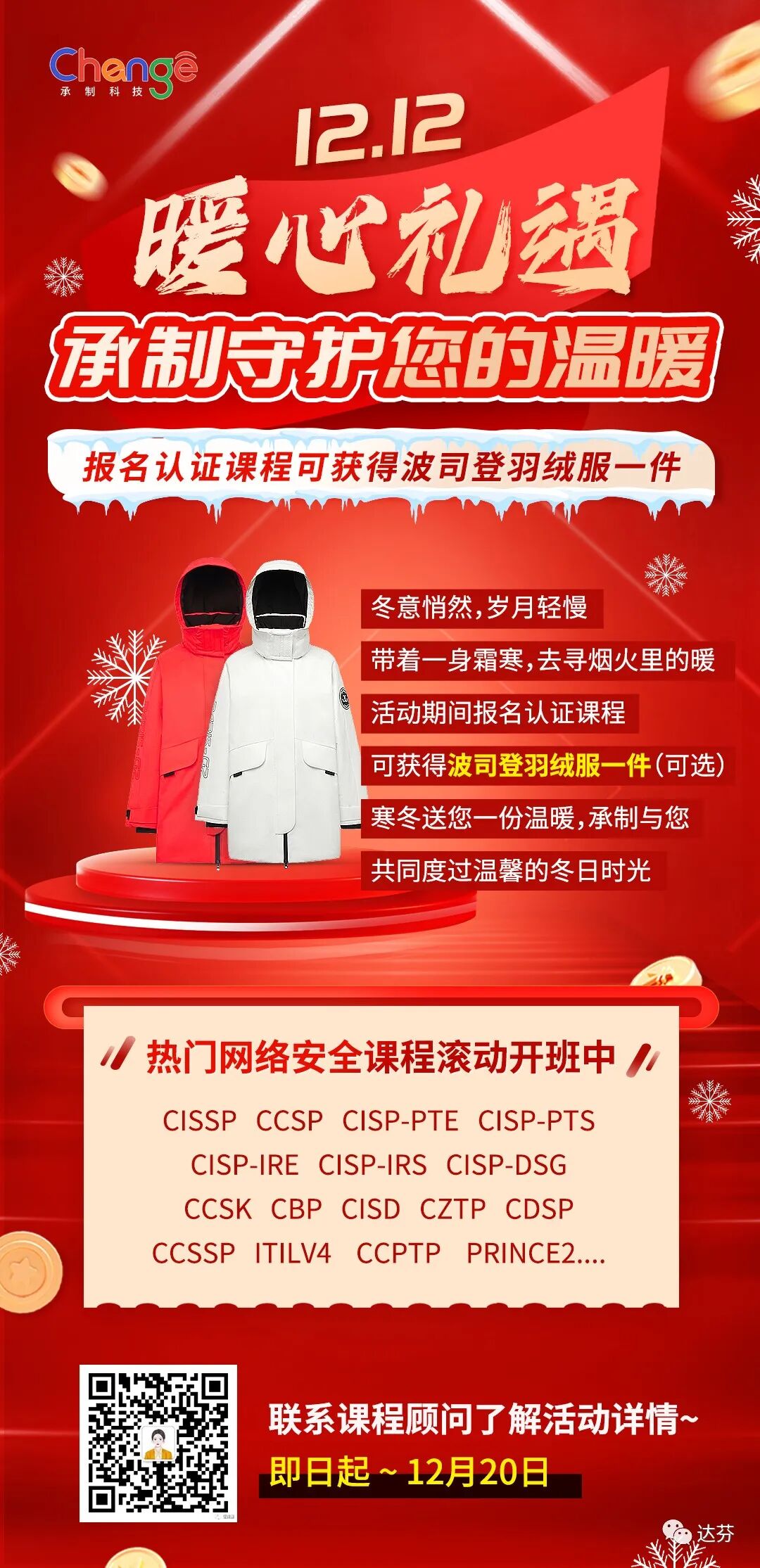 双十二年终狂欢火热进行中~报名CISSP、CCSP、CISP-PTE、CISP-PTS、CISP-IRE、CISP-IRS、CISP-DSG、CCSK、CDSP、CZTP、ITIL4等符合活动标准的认