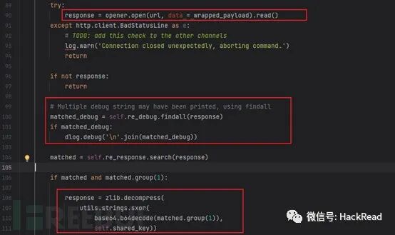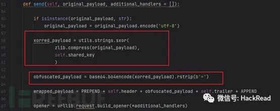 第三步:Client通过解密函数utils.sting.sxor()、zlib.decompress()、base64.b64decode()对接收服务端响应的body字符串进行解密,并判断字符串是否和send()函数发送到服务端的“X”值相同,从而判断客户端与服务端是否能够成功建立通信。