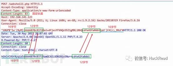 通过反向加解密得到请求body位置加密内容为:“echo(81232);”,其中“81232” 是随机的数字组合(11111-99999)。根据加密的方法可知:当“X”为5个数字相同组合时,其加密后字符串长度为23个字节;当“X”为前四个数字相同或者后四个数字相同组合时,其加密后字符串长度为24个字节;当“X”为其他情况组合时,其加密后字符串长度均为27个字节。根据固定长度计算方法:16(随机字符)+ 12(秘钥)+ len(X) + 12(秘钥)+ 16(随机字符)可知Content-Length值为:83/80/79,此处证明了之前的猜想是成立的。