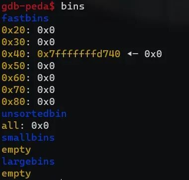 在gdb里s步入调试,可以看到触发了malloc_consolidate机制。原因如下,因为libc再分配large chunk时,fastbin中有p1这个chunk存在,所以会调用malloc_consolidate()函数整合fastbins中的chunk,并放入unsorted bin或top_chunk;然后unsorted bin中的chunk又会被取出放入各自对应的bins。(这个bins为small bin和large bin。这也是chunk唯一进入small bin和large bin的机会)。