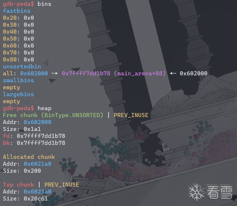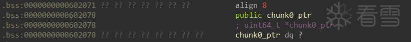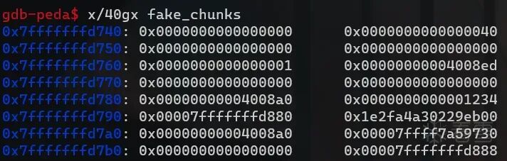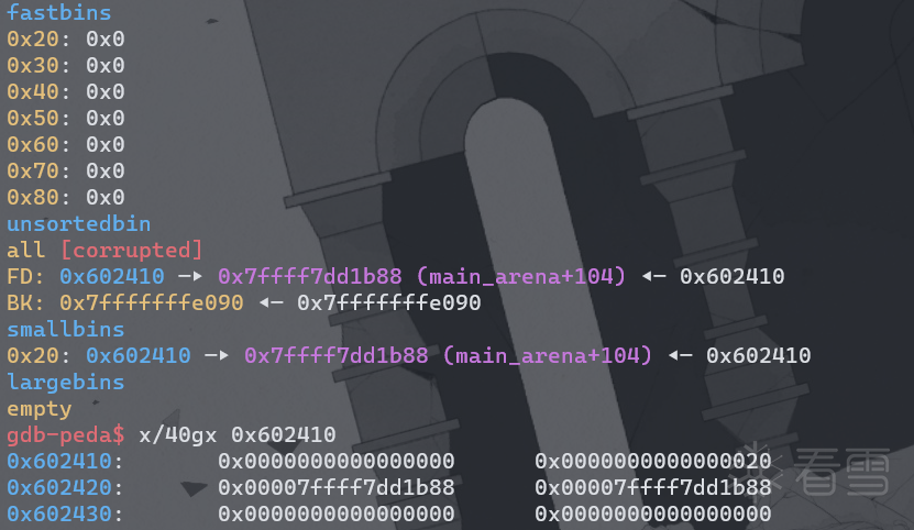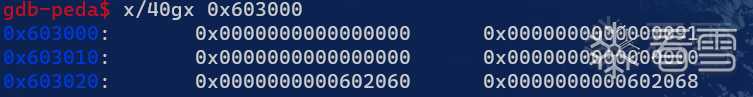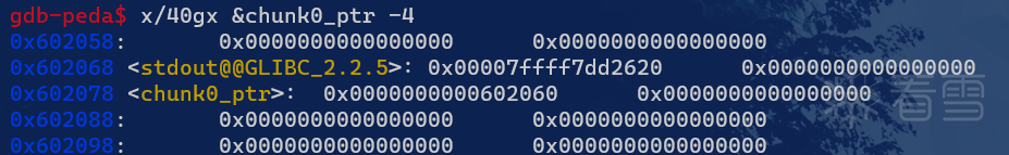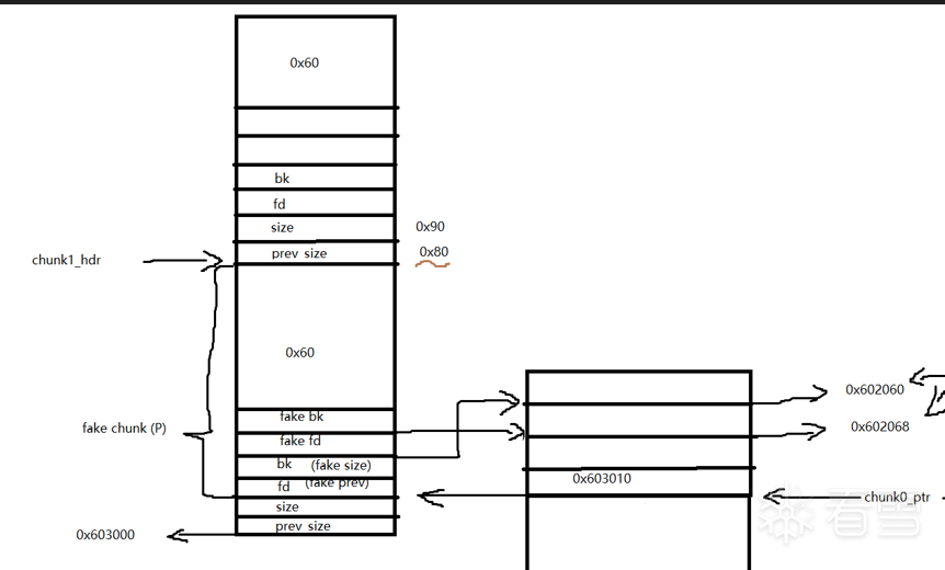 此时chunk0的堆结构。可以看到chunk0_ptr指向chunk0_fd(0x603010)的位置。chunk0_fd_nextsize和chunk0_bk_nextsize已被修改为全局变量(bss节)处的地址。