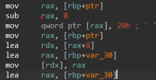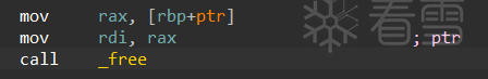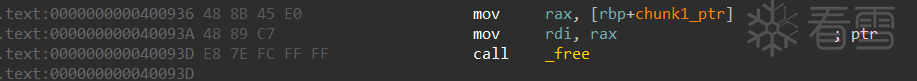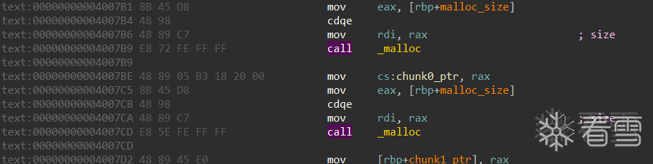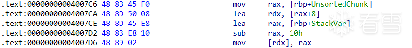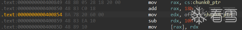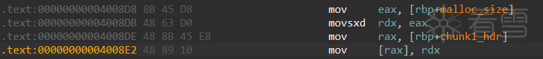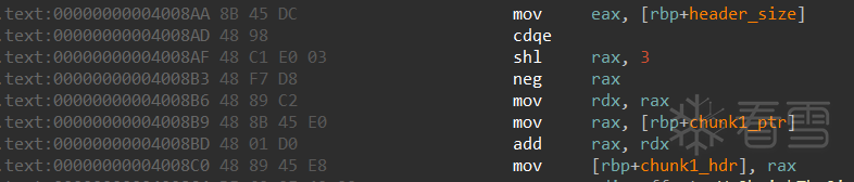 接下来cdqe指令将EAX寄存器中的DWORD(32 位值)符号扩展为RAX寄存器中的 QWORD(64 位值)。然后利用shl指令逻辑左移三位,再利用neg指令求补。最后也就是将chunk1_hdr的内容改为chunk1_ptr-2(chunk1_prev_size)的地址。