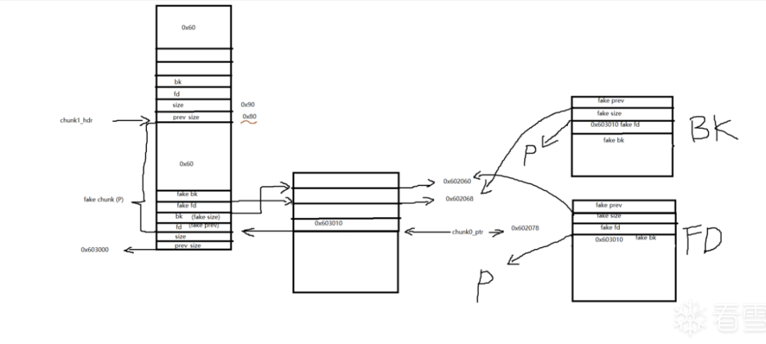 那么此时FD=P->FD和BK=P->bk,FD->bk == P, BK->fd == P。可以能够看到成功绕过glibc2.23检查。注意,我画的时候是根据布局画的,堆由低向高地址增长(由高向低画),bss由低向高画的。
