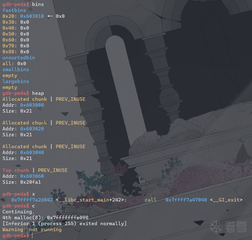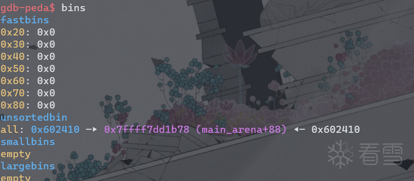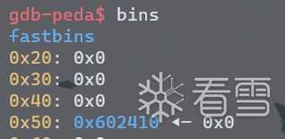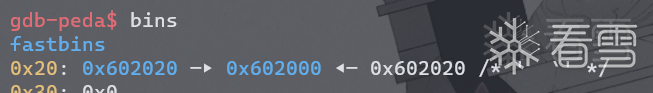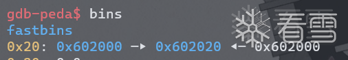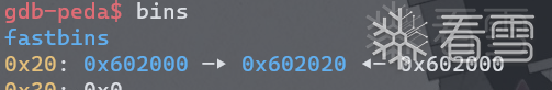 再次查看bins,因为申请两次后,fastbins中剩下f1(0x60300),而0x60300指向0x603020没有改变,0x603020指向0x60300也没变,并且fastbins中的chunk标记为prev_inuse一直为1,所以fastbins中依然保留这个ABA结构。