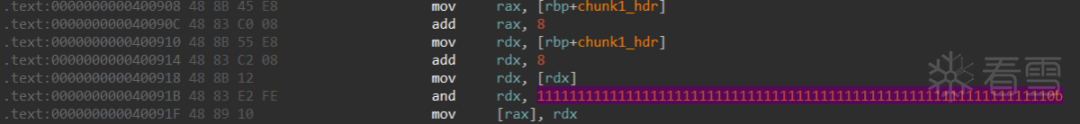 然后利用and指令(与运算有零则零)把chunk1_hdr+1也就是chunk1_size的PREV_INUSE位改为0。