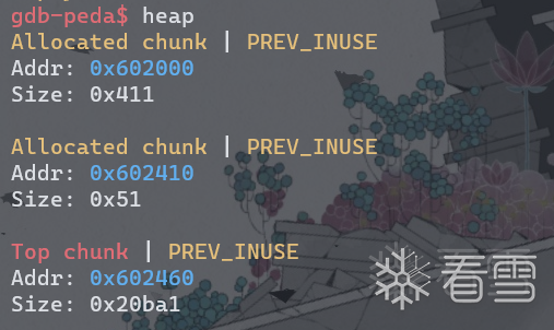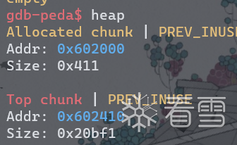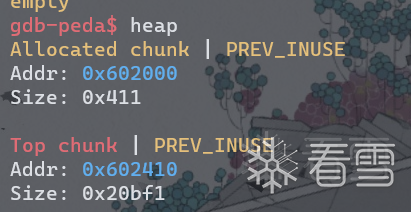 查看堆结构, 可以看到多出来一块0x411大小的堆块。