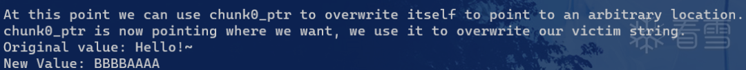 chunk0_ptr[3] = (uint64_t) victim_string;printf("chunk0_ptr is now pointing where we want, we use it to overwrite our victim string.\n");