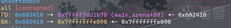 然后把chunk1给free()掉因为其PREV_INUSE为0,又是small bin大小,触发unlink,要将P这个fake chunk摘除。