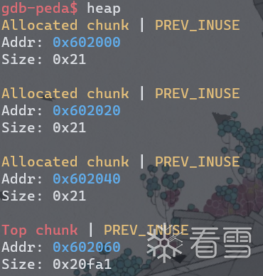 查看堆信息,三个fastbin的堆块,f1,f2,f3。