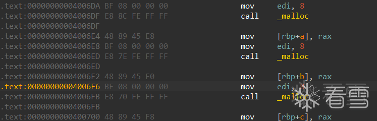 int *c = malloc(8);fprintf(stderr, "1st malloc(8): %p\n", a);