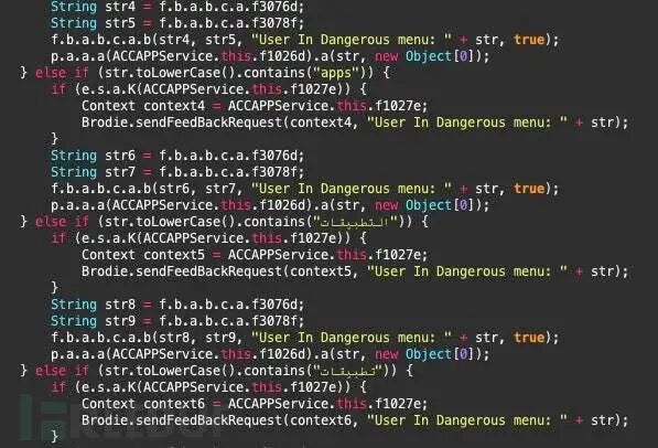 这个类负责处理跟C2的通信,并且包含了与用户卸载应用程序的相关代码。SendToServerTask子类在用户进入“dangerous”菜单时进行日志记录,并解析包含英语单词“apps”或“applications”以及阿拉伯语单词“applications”的活动菜单名称:
