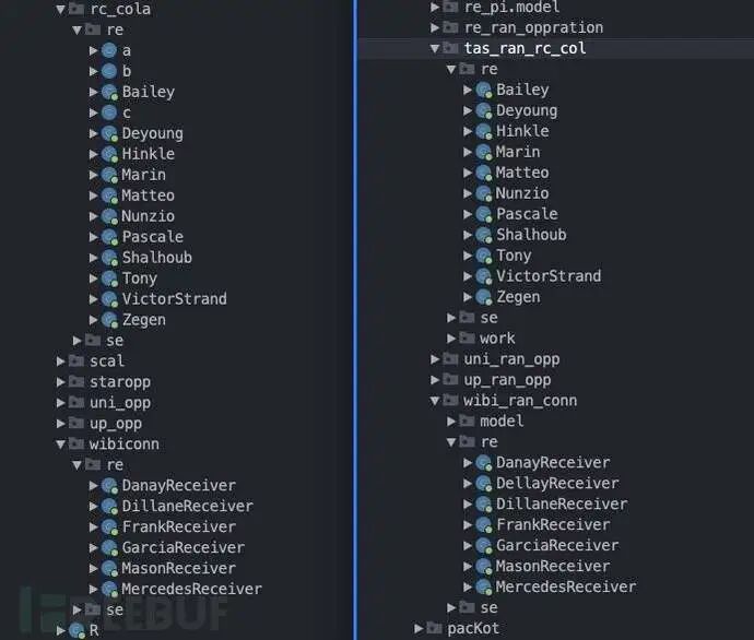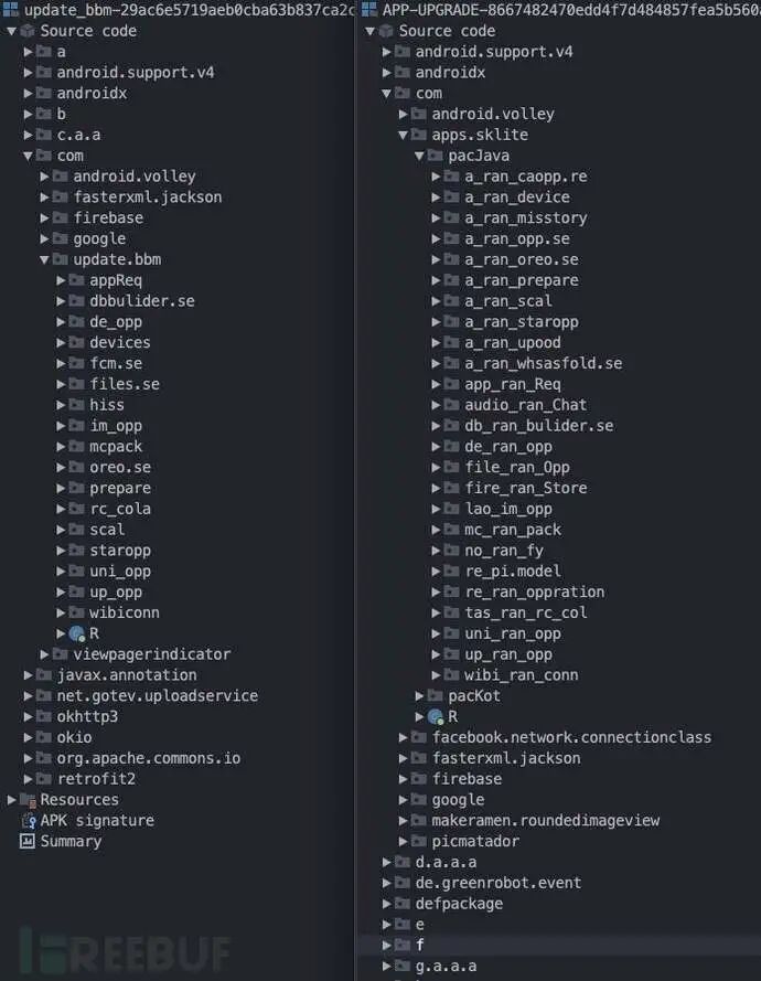 研究人员将将这些新版本与旧的SpyC23变种进行比较后发现,包名也有明显的重复,这也表明了新版与旧版之间的紧密联系。在下图中,左边的旧版本在update.bbm包中包含恶意代码,而右边的版本在apps.sklite.pacJava包中也包含了类似的子包: