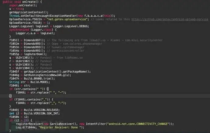 Panda类不仅可以从开源的Gotev Android Upload Service导入方法(旧版本的SpyC23也使用该服务),而且Panda还可以从OKhttp库导入方法来处理HTTP请求。当OnCreate方法运行时,它会初始化Gotev服务,解析C2配置值,并注册GarciaReceiver(一个监控连接状态变化的接收器),这种情况在旧版本样本中也存在。