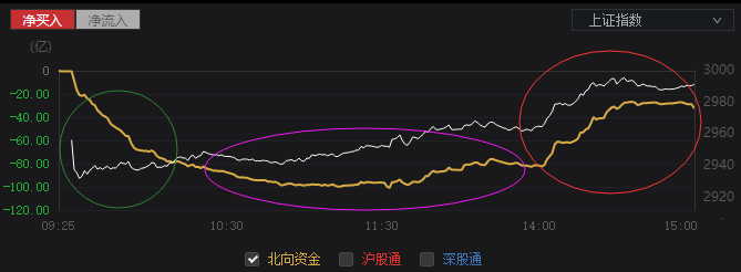 第三个阶段,日内反攻,指数不断反弹,北向局部回流。