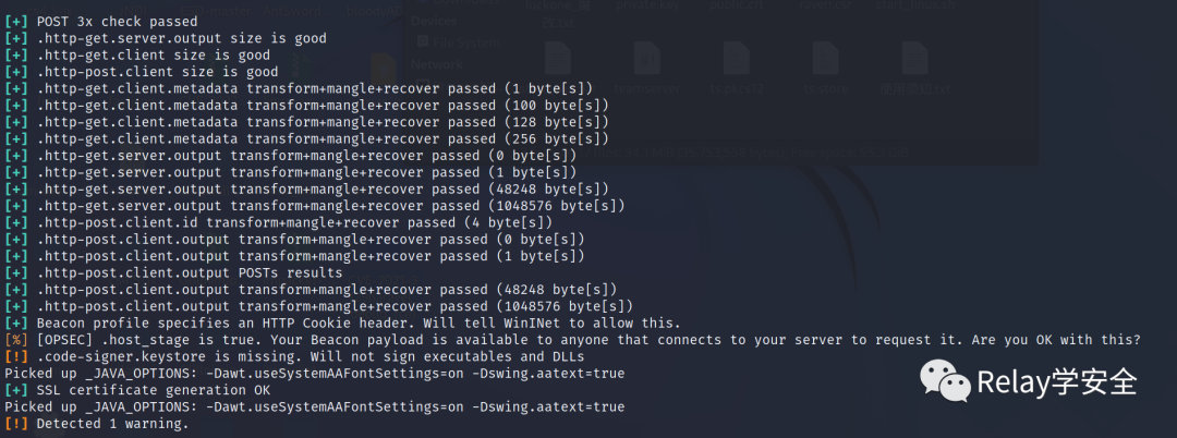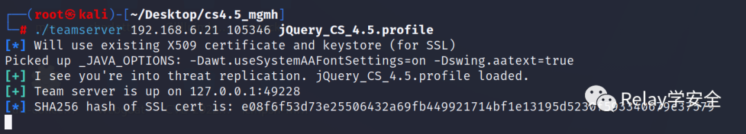./c2lint jQuery_CS_4.5.profile端口为 49228,只能本地访问(127.0.0.1),也使用刚刚做好的ts.store证书# start the team server.java -XX:ParallelGCThreads=4 -Dcobaltstrike.server_port=49228 -Dcobaltstrike.server_bindto=127.0.0.1 -Djavax.net.ssl.keyStore=./ts.store -Djavax.net.ssl.keyStorePassword=zsx147a -server -XX:+AggressiveHeap -XX:+UseParallelGC -classpath ./cscdf_luckone.jar -javaagent:CSAgent.jar=f38eb3d1a335b252b58bc2acde81b542 -Duser.language=en server.TeamServer $*