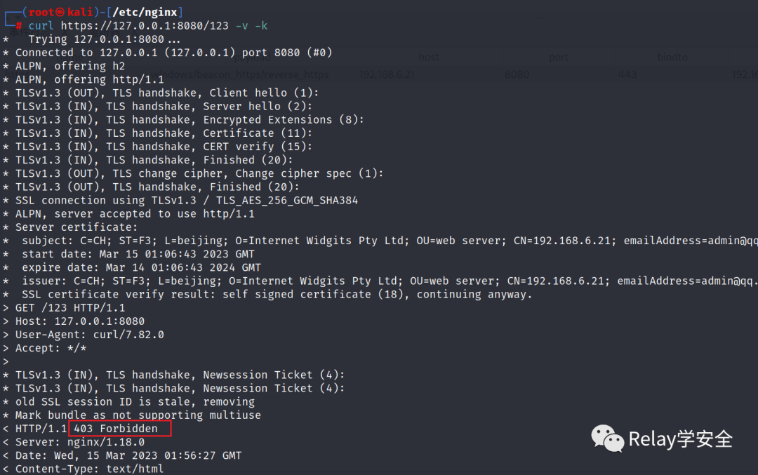 首先我们可以先把 CS服务器端口和监听器端口置于防火墙之后,这样情报平台就收集不到我们的 C2 服务器。然后通过反向代理,将CS监听器的 443 端口的流量反向转发到转发器 (Nginx,Apache2,Socat 等) 的运行端口 8443,最后再根据 URL、User Agent、Cookie等属性配置过滤规则。不符合条件的请求 ,将被重定向到不相干页面 (例如google.com、403页面、404页面)等。为了后续操作方便,我把生成的证书和密钥先分别放在/etc/ssl/certs/和/etc/ssl/private/目录下