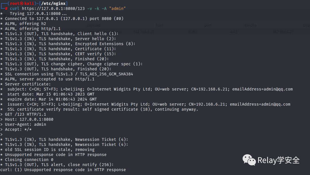 curl https://127.0.0.1:8080/123 -v -kcurl https://127.0.0.1:8080/123 -v -k -A "Mozilla/5.0 (Windows NT 10.0; Win64; x64) AppleWebKit/517.36 (KHTML, like Gecko)" # 设置 User-Agent: admin
