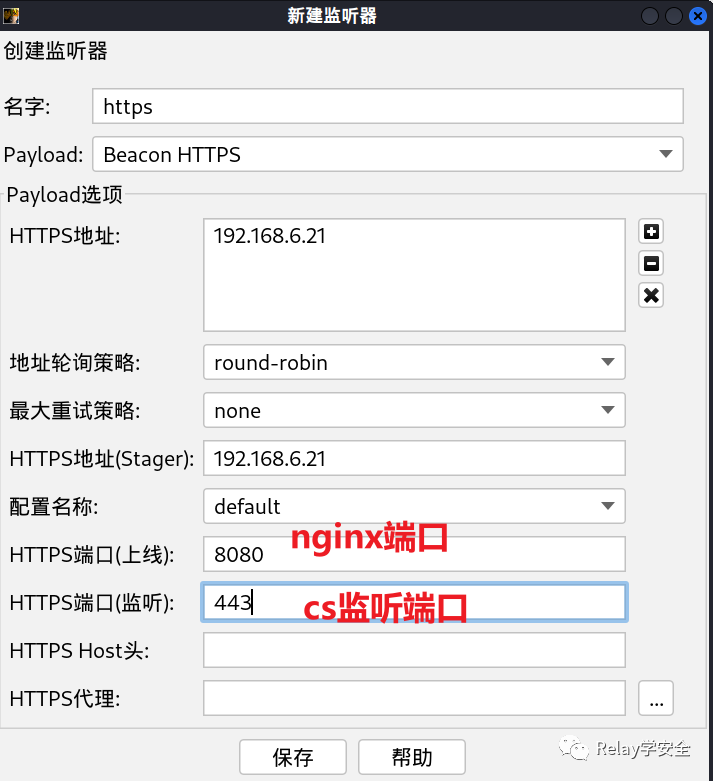 我们通过 Nginx 充当反向代理来保护CS 的监听端口所以我们在 CS 中的监听器这样设置,HTTP Port (C2) 为 Nginx 监听端口,HTTP Port (Bind) 为 Cobalt Strike 的监听器端口