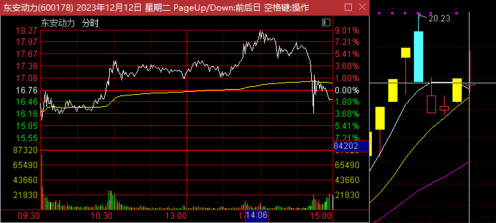 当时瞬间冒出来好多形态近似的票大涨,有天威视讯,中广天择,圣龙股份,东安动力,惠发食品,等等。后来东安动力大跳水,从最高9%到收盘-1%,开始出现亏钱效应了。