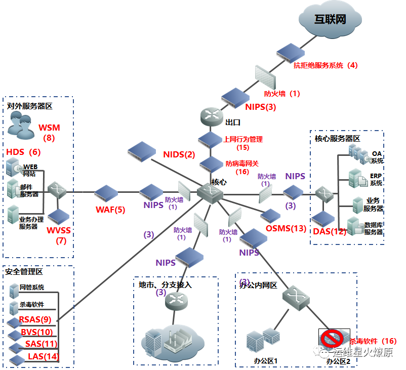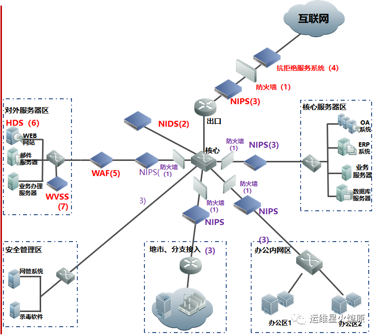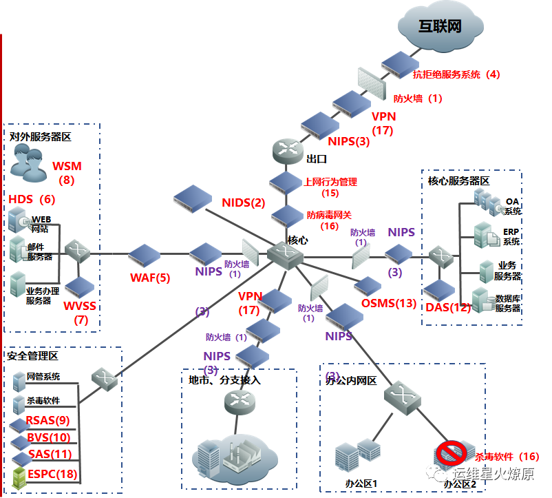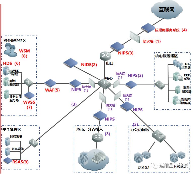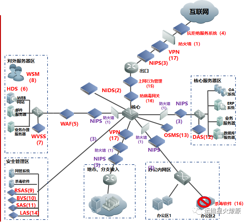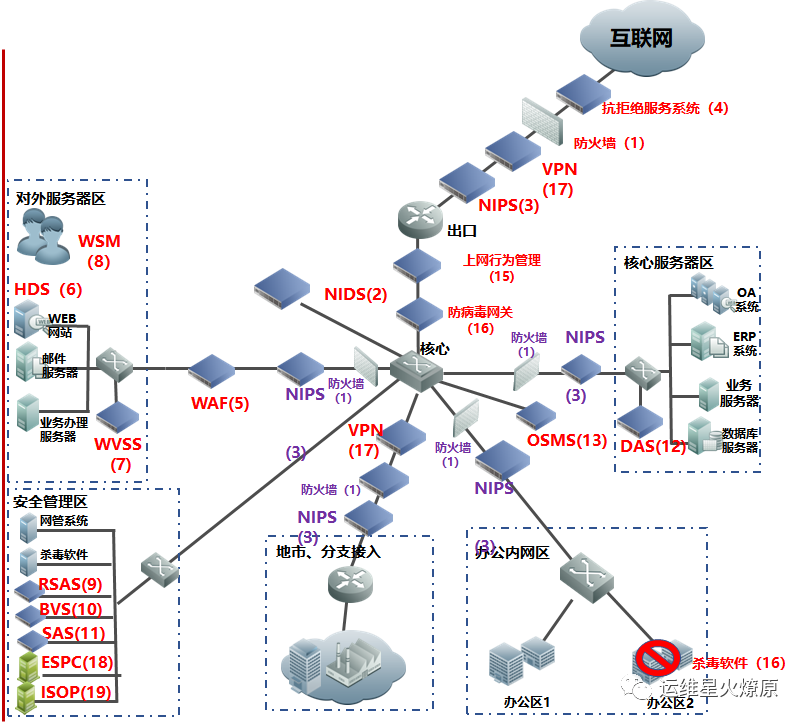 | Web应用防火墙 | WAF | 在线部署,防止SQL注入,网站挂马,远程缓存溢出,cookie、Session劫持,实现恶意代码主动防御、网页的文件过滤驱动保护、防跨站攻击、防SQL注入、爬虫和网页盗链防护、网页防篡改系统功能。【应用层防护】 | 对外或内部Web服务器区 |