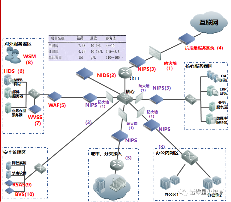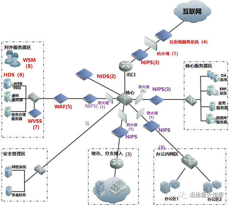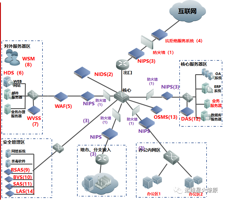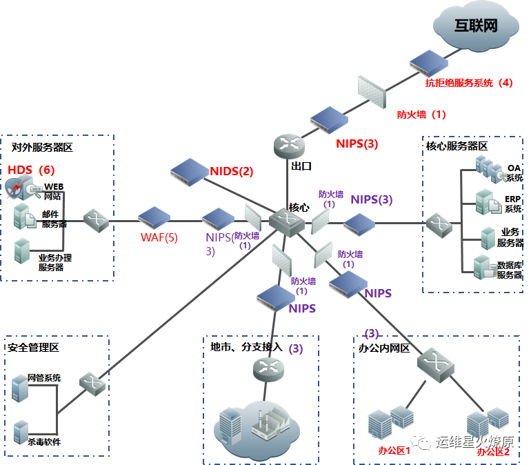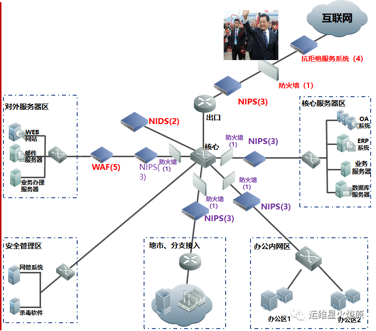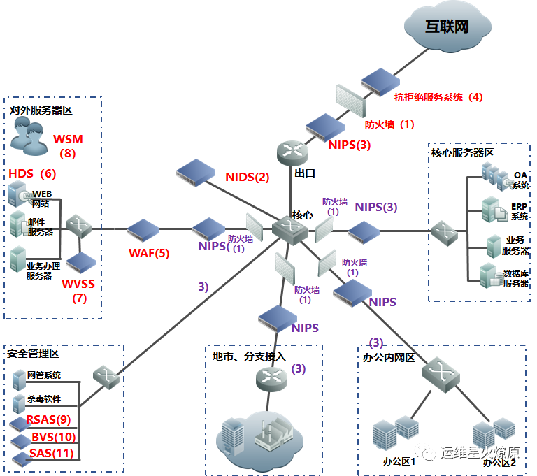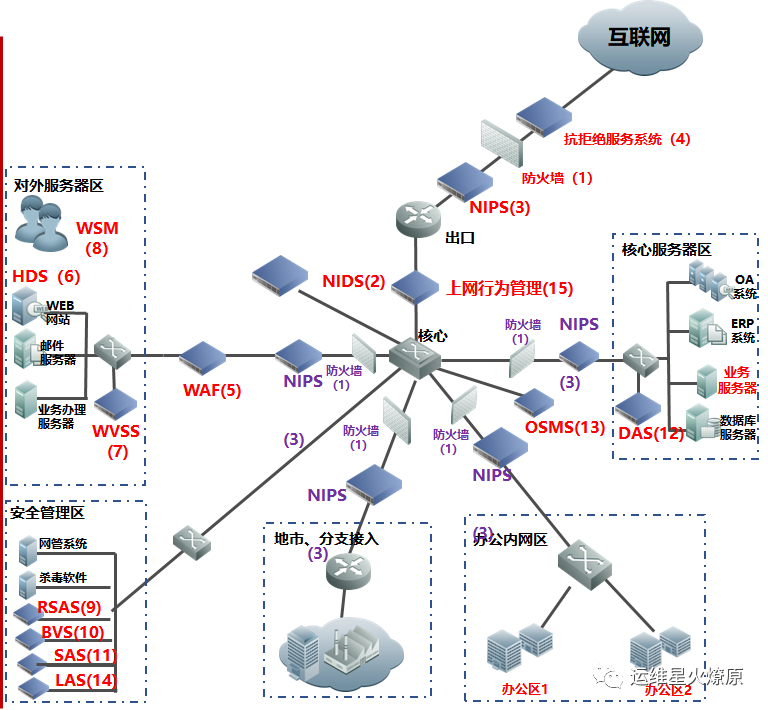 | Web应用防火墙 | WAF | 在线部署,防止SQL注入,网站挂马,远程缓存溢出,cookie、Session劫持,实现恶意代码主动防御、网页的文件过滤驱动保护、防跨站攻击、防SQL注入、爬虫和网页盗链防护、网页防篡改系统功能。【应用层防护】 | 对外或内部Web服务器区 |