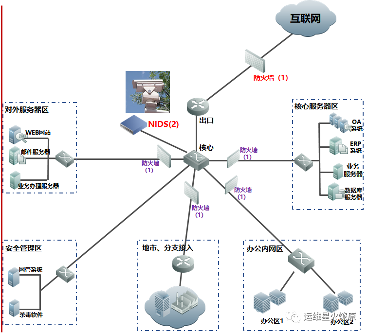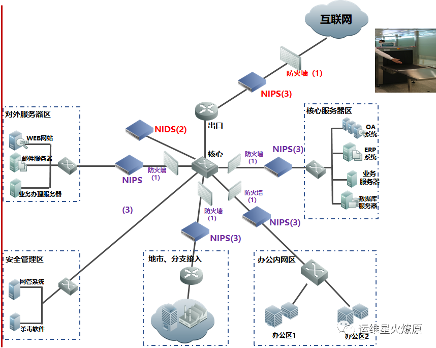 | 入侵检测系统 | NIDS | 旁入监听,通过端口镜像方式,监视并记录进入网络主体的行为 | 旁入在核心交换机、汇聚交换机。与防火墙互补、配合的关系 |