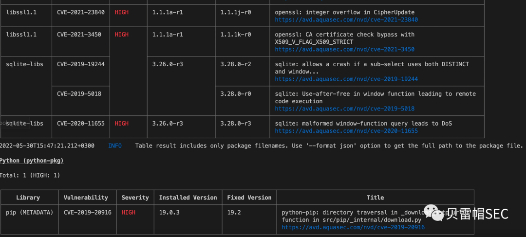 例子:trivy image python:3.4-alpinetrivy fs --scanners vuln,secret,config myproject/trivy k8s --report summary cluster