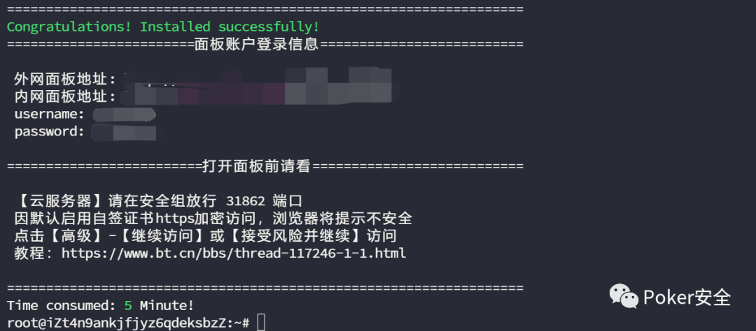 安装完面板之后会提示面板信息,这个要保存一下,然后记得去防火墙把端口开启