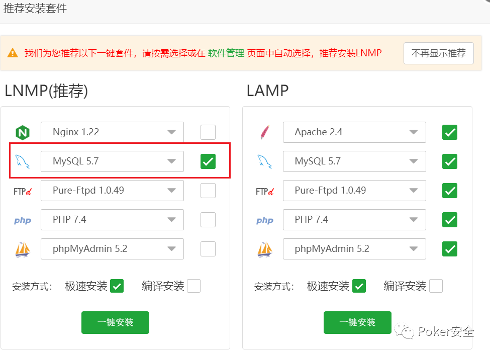 进入到宝塔面板里面,它会提示安装环境,由于只需要用到数据库,其他的软件不安装就行
