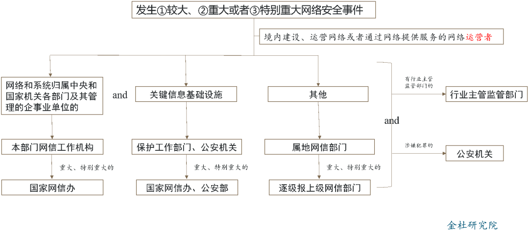 《管理办法》第四条规定了分工机制。总体上,由网信部门负责统筹协调网络安全事件报告工作和相关监督管理工作,包括国家和地方层面。具体还要分为以下情形: