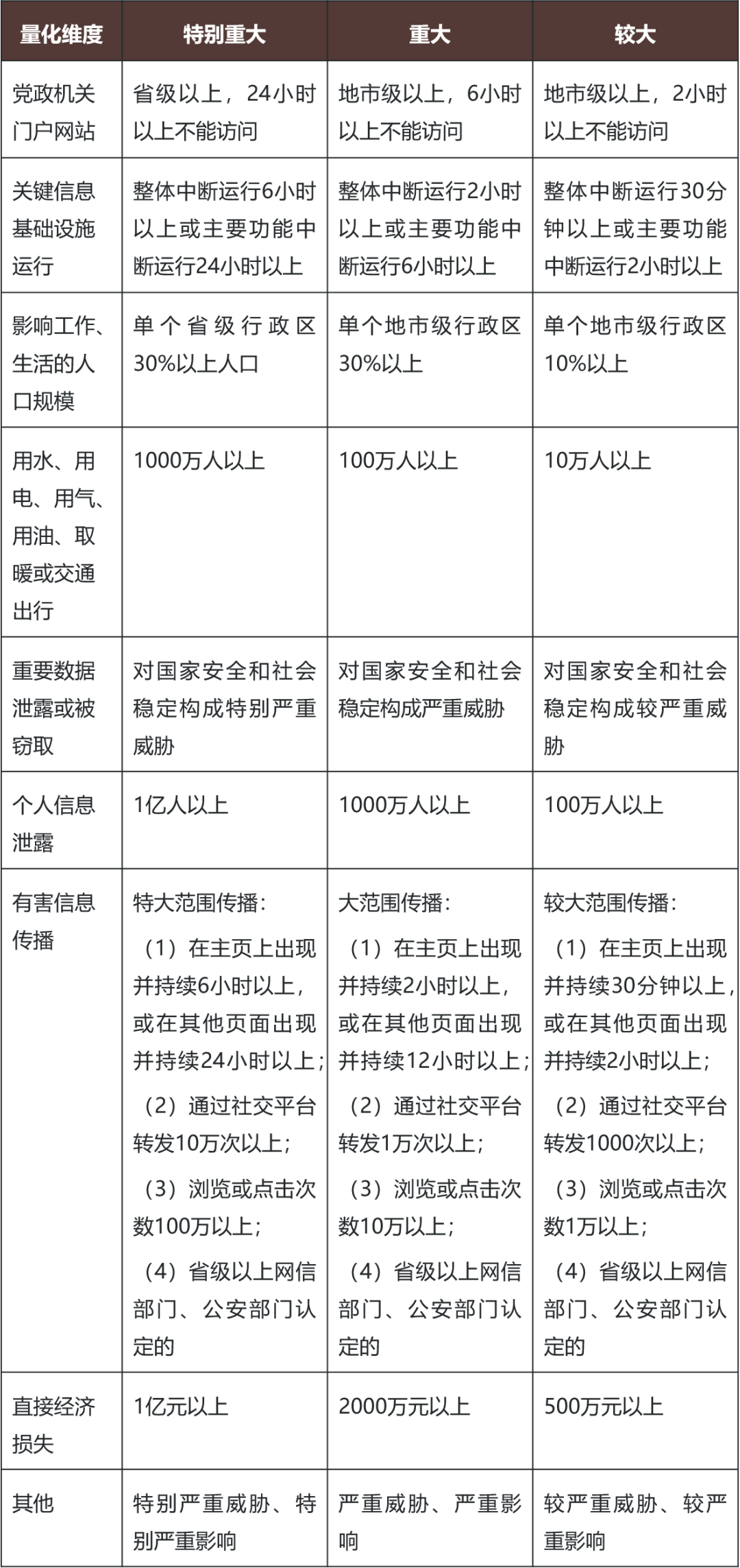 识别上,《分级指南》给出了对特别重大、重大和较大网络安全事件的可量化识别条件,主要考虑对党政机关门户网站,关键信息基础设施运行,正常工作和生活秩序、重要数据、个人信息等影响的程度,有害信息传播的范围,经济损失规模等方面,同时也设置了用于参照衡量和判断的兜底情形。