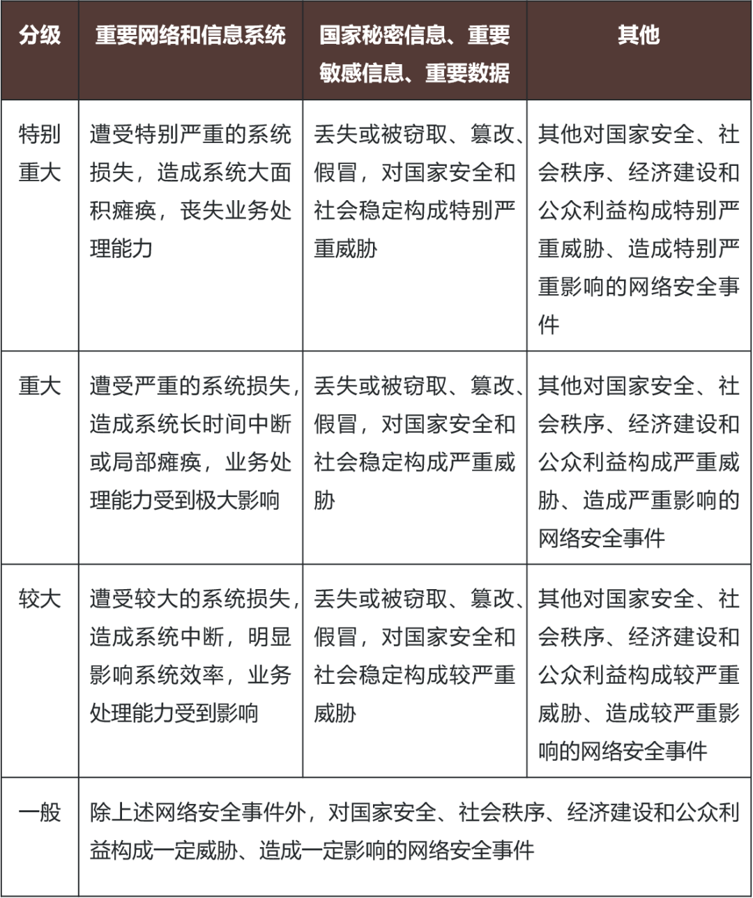 在区分网络安全事件从轻到重四种级别的情形上,主要考量的因素集中于两个方面,一是网络和信息系统是否处于正常运行的状态,以及安全事件造成系统或者业务的瘫痪程度或受影响范围;二是国家秘密信息、重要敏感信息、重要数据是否完整、保密、可用,同时还规定了兜底情形,即其他对国家安全、社会秩序、经济建设和公众利益造成威胁、影响的事件。