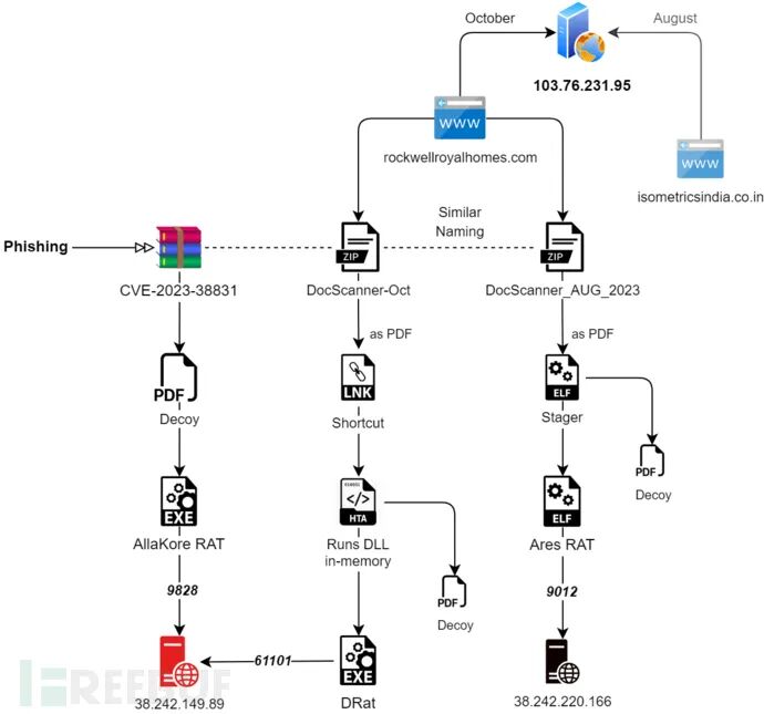 有趣的是,我们发现Ares RAT的Linux变种也使用了相同的诱饵PDF,这种情况是我们在8月份最后一周的VirusTotal报告样本中发现的。如下图所示,SideCopy威胁行为者所使用的两个入侵域名都解析为了相同的IP地址。他们四月份所使用的域名ssynergy[.]in和五月份所使用的域名elfinindia[.]com也都指向了相同的IP地址。除此之外,他们托管在不同域名上的文档文件都具有相同的文件名称,这也表明了入侵域名重用的情况。