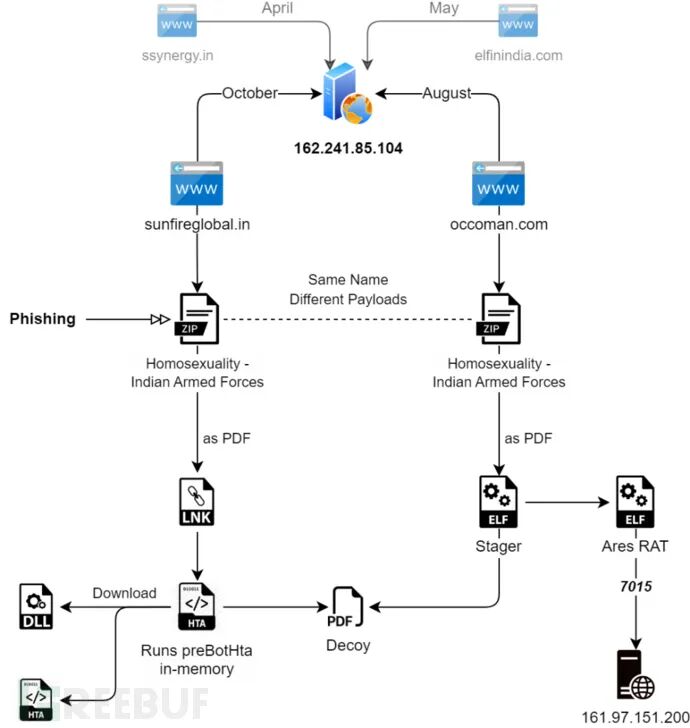 除此之外,它还会部署一种名为Ares RAT的Linux变种(一个开源代理),研究人员在其Stager Payload中发现了与威胁组织Transparent Tribe (APT36) 相关的代码,表明SideCopy和APT36使用相同的诱饵和命名约定同时进行多平台攻击,共享基础设施和代码,以攻击印度目标。