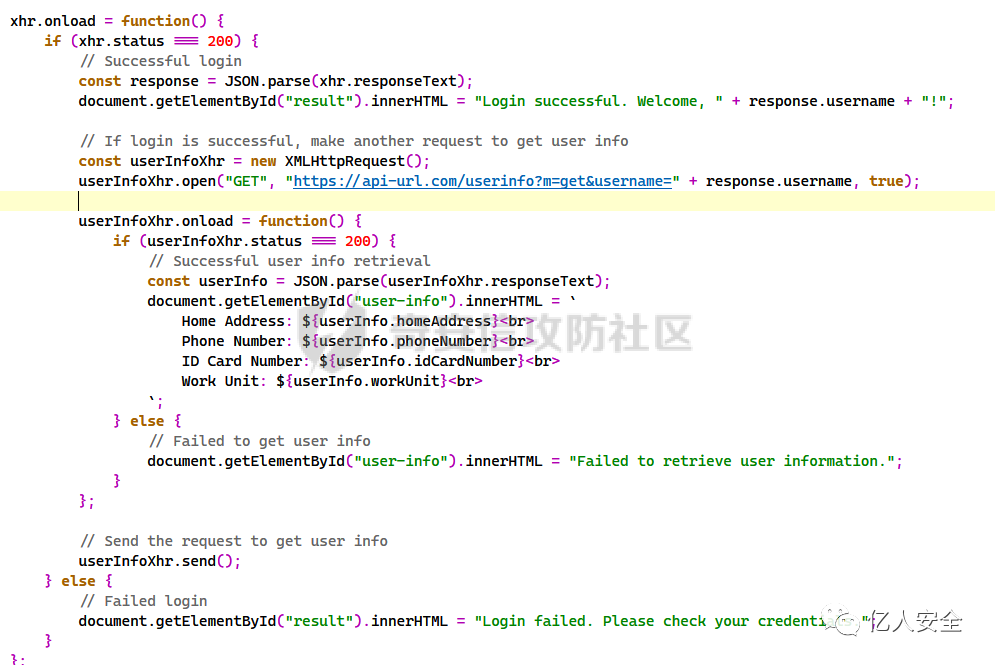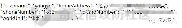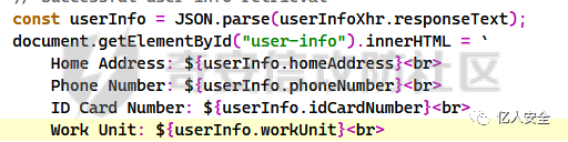 在这两行代码中,通过调用/userinfo?m=get&username=<YourName>这个接口,我们发现可以只需要提供用户名就可以执行下面的操作不需要提供其他验证。我们可以发现,通过用户名我可以获取家庭住址、电话号码、身份证号码和工作单位这些敏感信息。