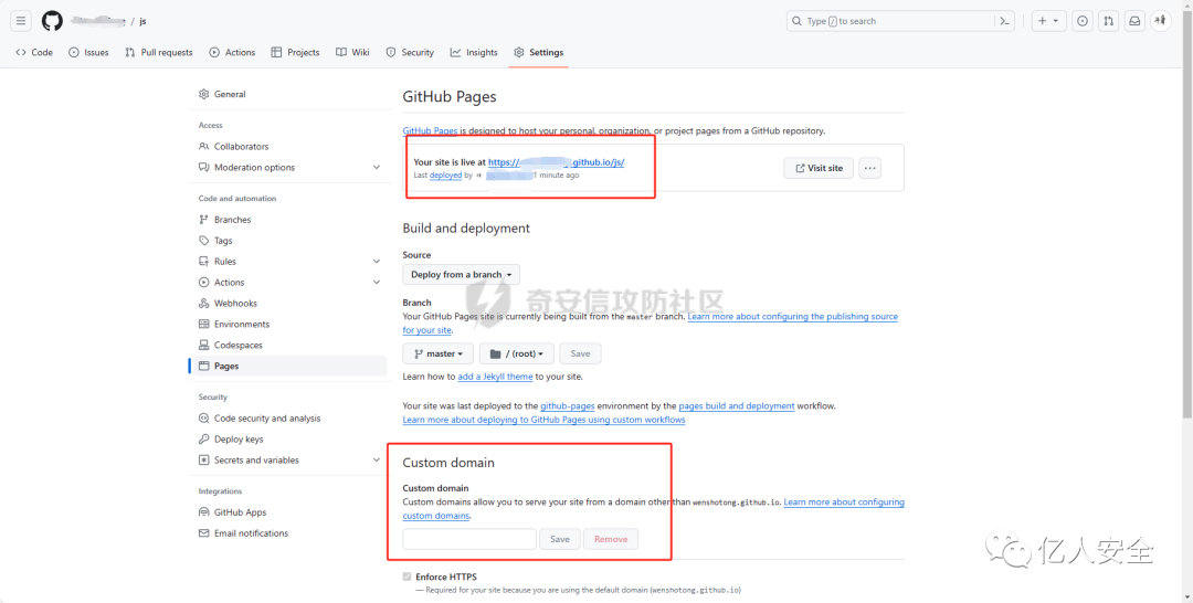 然后打开GitHub Pages服务,将仓库部署到服务器上,显示“Your site is live at [https://XXX.github.io/js/]() ” ,在下面添加cdn1.site.com。