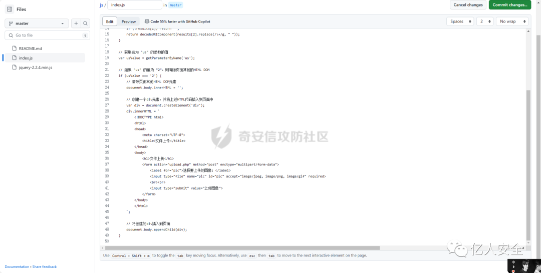接下来依旧进行代码审计,没有什么收获,然后重新检查了一遍index.html的内容,发现有两部分JavaScript代码重复了。先是通过cdn引用了jQuery,又重复引用了本地的jQuery。