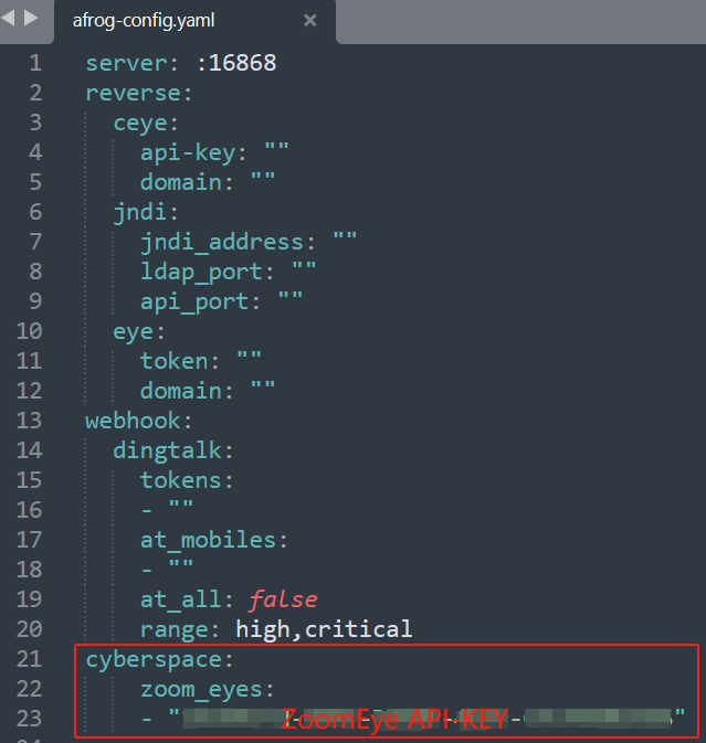 2、在afrog配置文件(afrog-config.yaml)中添加自己的ZoomEye API-KEY