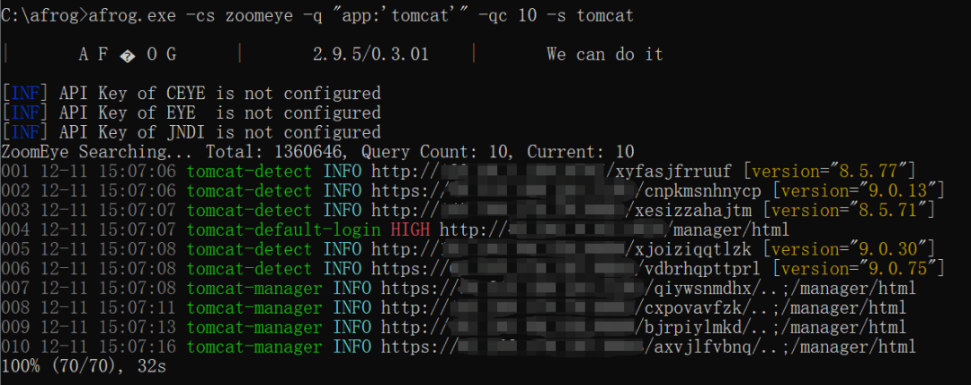 afrog.exe -cs zoomeye -q "app:'tomcat'" -qc 10 -s tomcat该命令的含义是:在 ZoomEye 网络空间搜索引擎中使用app:"tomcat"语法搜索Tomcat相关资产,并使用afrog -s tomcat参数搜索关键字包含tomcat的POC插件进行批量探测扫描漏洞。