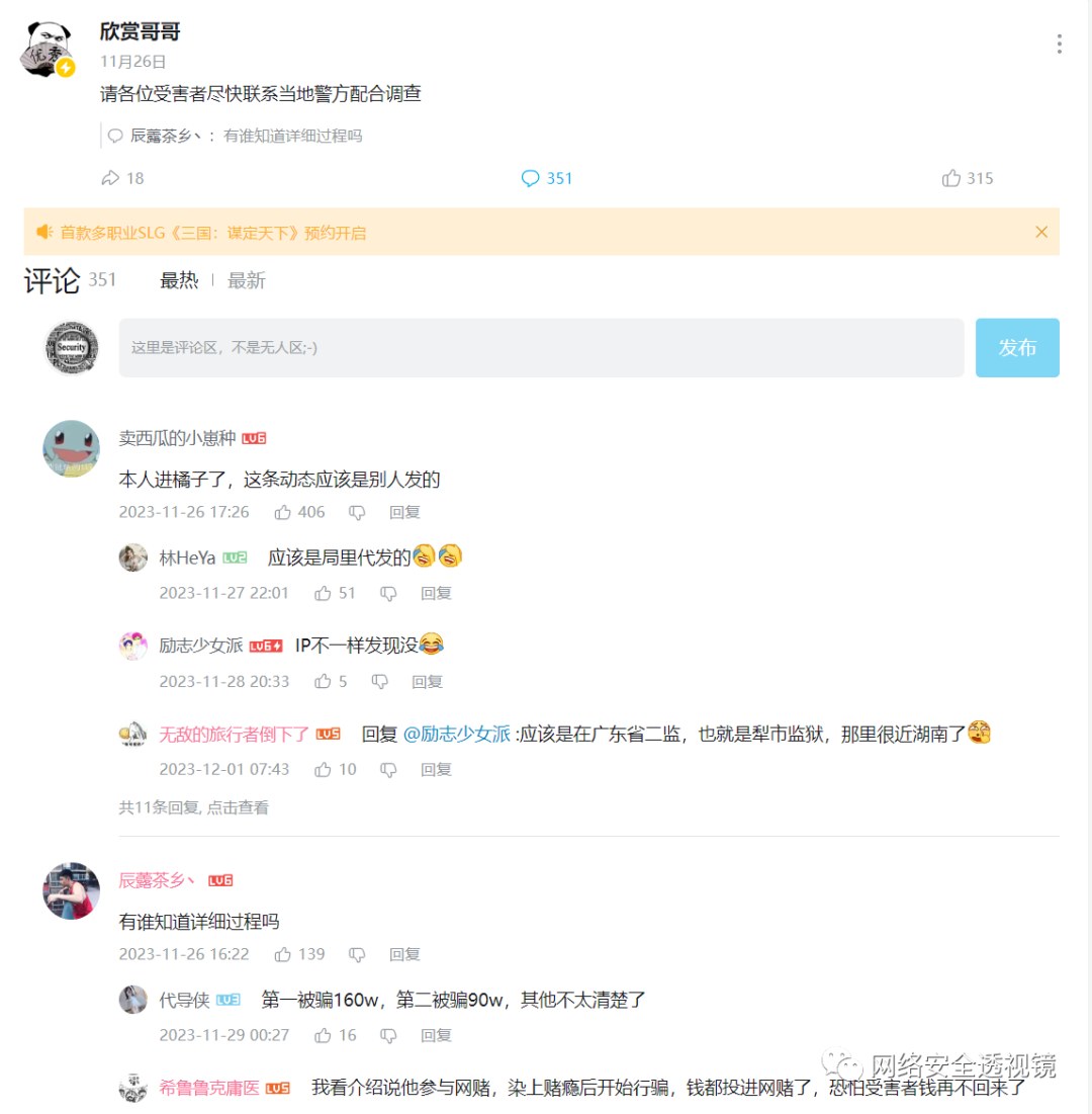 11月26日,欣赏哥哥的B站账号发布了这么一条动态:请各位受害者尽快联系当地警方配合调查。