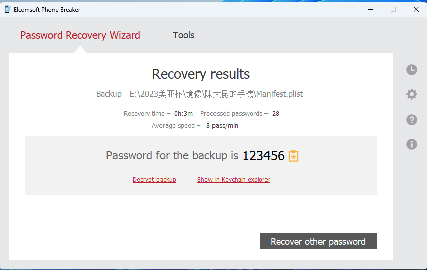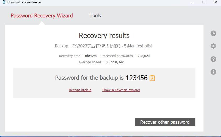 85也是一道题,不过考点单一,就是破iTunes备份密码。比赛时想歪了,老想从其他镜像中找密码,直接爆就完了。可以使用4501的爆破功能,或者elcomsoft phone breaker尝试,不过效果感觉不太好,123456都试了42分钟,用字典稍好,3分钟。