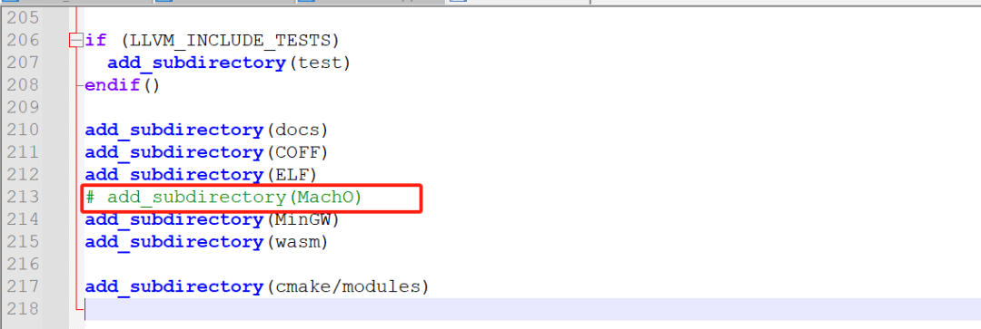 这里需要修改一下LLVM的源码,首先是llvm\lib\CMakeLists.txt文件,因为本身在window上编译是没有Mac的环境,因此会报一些Mac的头文件错误,我们只需要MACRO的组件去掉就行了。