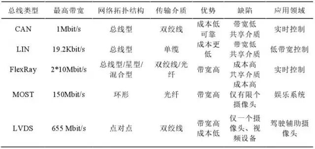 当前主流的车载网络主要由 CAN、LIN、FlexRay、MOST 、LVDS等构成。除了LVDS这些网络标准基本上都是面向汽车行业制定,有着浓重的汽车行业特色。表1中对各种不同网络形式对了简要的对比。
