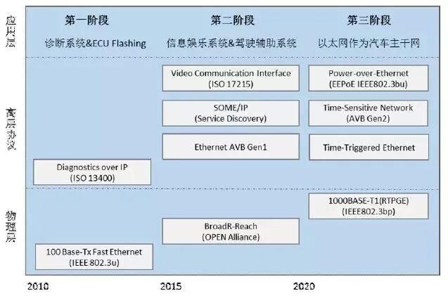 以太网作为一种新型车载网络的进入汽车网络,肯定是无法一蹴而就,在短期内是无法取代现有的车载网络,因此以太网在进入汽车网络时考虑分阶段、从子系统开始逐步深入,并最终统筹汽车网络的演进过程。现今可预期的车载以太网的发展主要可分为三个阶段: