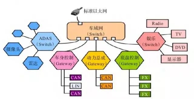 如第二部分所述,汽车电子发展的趋势似乎表明以太网将取代CAN成为骨干网,而子网将是由若干域控制器(Domain Controller)组成的车载网络结构。如图,该车载网络以高速以太网作为骨干,将5个核心域控制器(动力总成、底盘控制、车身、娱乐、ADAS)连接在一起。各个域控制器在实现专用的控制功能的同时,还提供强大的网关功能。这种基于域控制器的架构改变传统的车载网络中ECU到ECU的点到点通信方式,如:在车身控制域内部,各部件通过CAN、LIN沟通实现数据共享(类似于传统车载网络架构),在娱乐子网中,娱乐域控制器与其子部件的通信将通过以太网实现;当一个域需要与其他域交换信息时则经由网关、以太网路由实现。