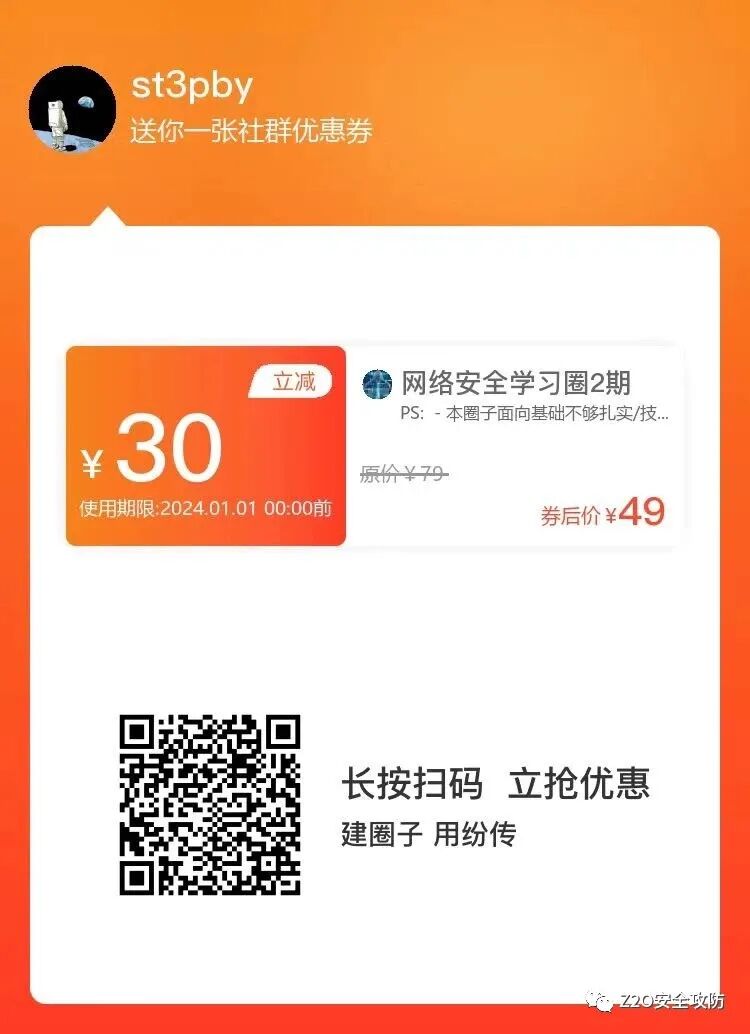 距离《网络安全学习圈 第一期》封闭已经有一段时间了。在 第一期 中,一共有540名师傅与我们一起学习,我们共发布了26周的学习任务,对数十名师傅的学习成果进行了返现,退还圈费,以及抽送了多本安全书籍。 2023-12-14 20:57:53 Author: Z2O安全攻防(查看原文) 阅读量:14 收藏