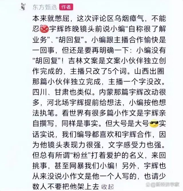 事情的起因,源自几天前,东方甄选小编置顶了一则的一则 " 宣传文案出自谁手 " 的答复引发了董宇辉粉丝的不满。