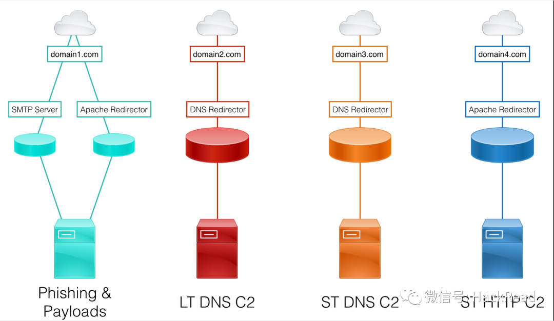 下面这个样例,使用了功能分离和转向器(redirector)的设计思路。其中LT DNS C2代表长期的 DNS C2 服务;ST DNS C2代表短期的 DNS C2 服务;ST HTTP C2 代表短期的 HTTP C2 服务。